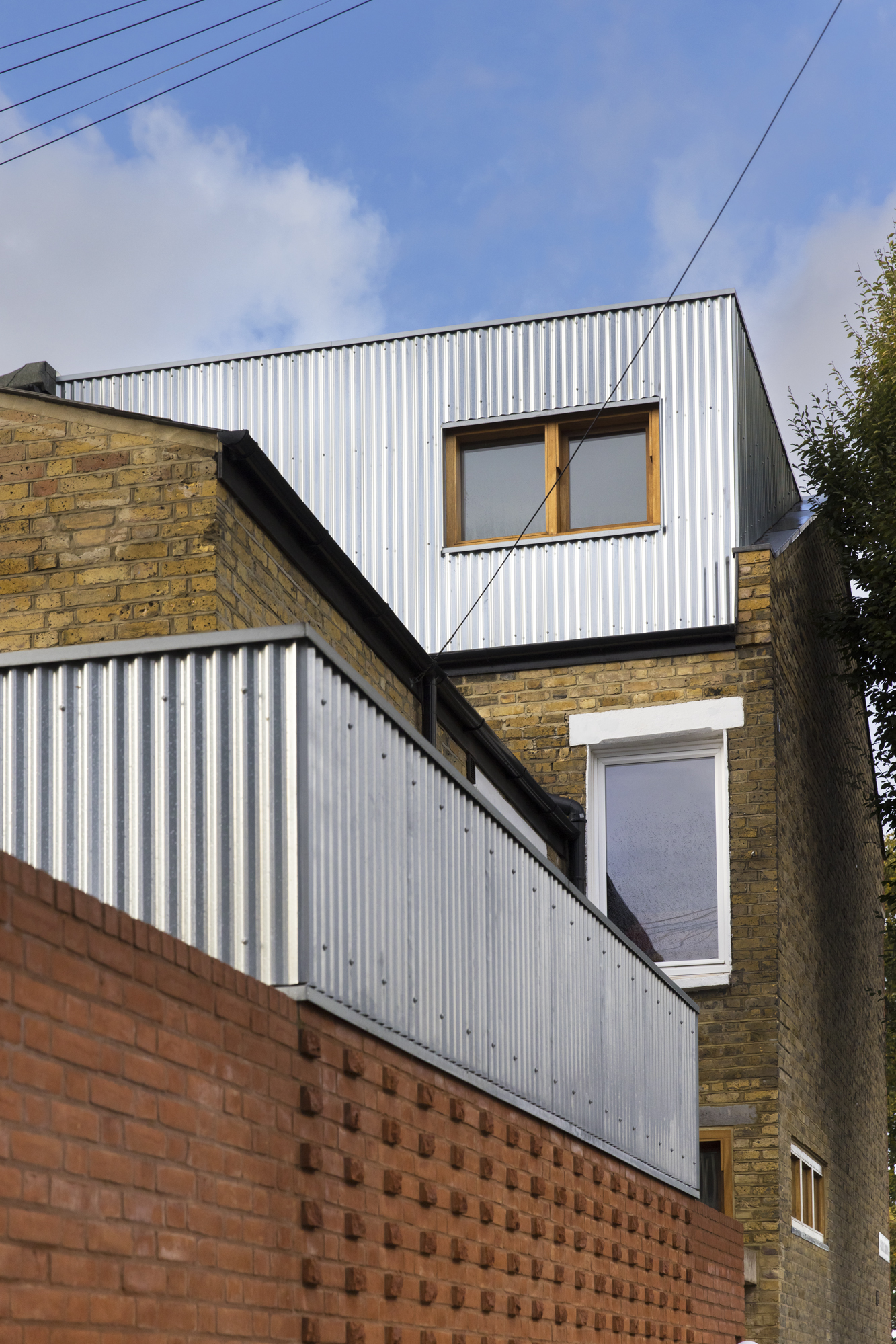 The house is end-of-terrace and overlooks Wanstead Flats: a vast semi-wild space that stretches all the way into Essex via the Epping Forest. The presence of this space became the key driver in the reconfiguration of the home. The Flats serve as a break-out space for the young family who will often return with muddy boots and buggies. Our proposal was to move the kitchen and dining space to the front of the house making the most of the long views and expansive skies and to move the main entrance to the side. This move creates a new dynamic for the house: permitting a generous decompression and storage space upon entry and allowing both main living spaces to make use of the full width of the house as a corridor was no longer required. Once these key moves had been made, the objective was to use materials and finishes that celebrated this new context and the new qualities of light that entered the house. Externally, the materials chosen were simple and functional: a deep red brick for the ground floor additions topped with a corrugated steel trim mirrored again with the new dormer at loft level. Internally, walls and ceilings were lined with a wood wool board that created a surprisingly intimate and comforting acoustic environment. A dark grey quarry tile runs inside and outside to tie together the internal spaces with the patio-garden at the rear. Amidst this restrained and texture palette, the new staircase running from ground to loft is painted in a bright, rich blue: providing a distinctive focal point on every level.