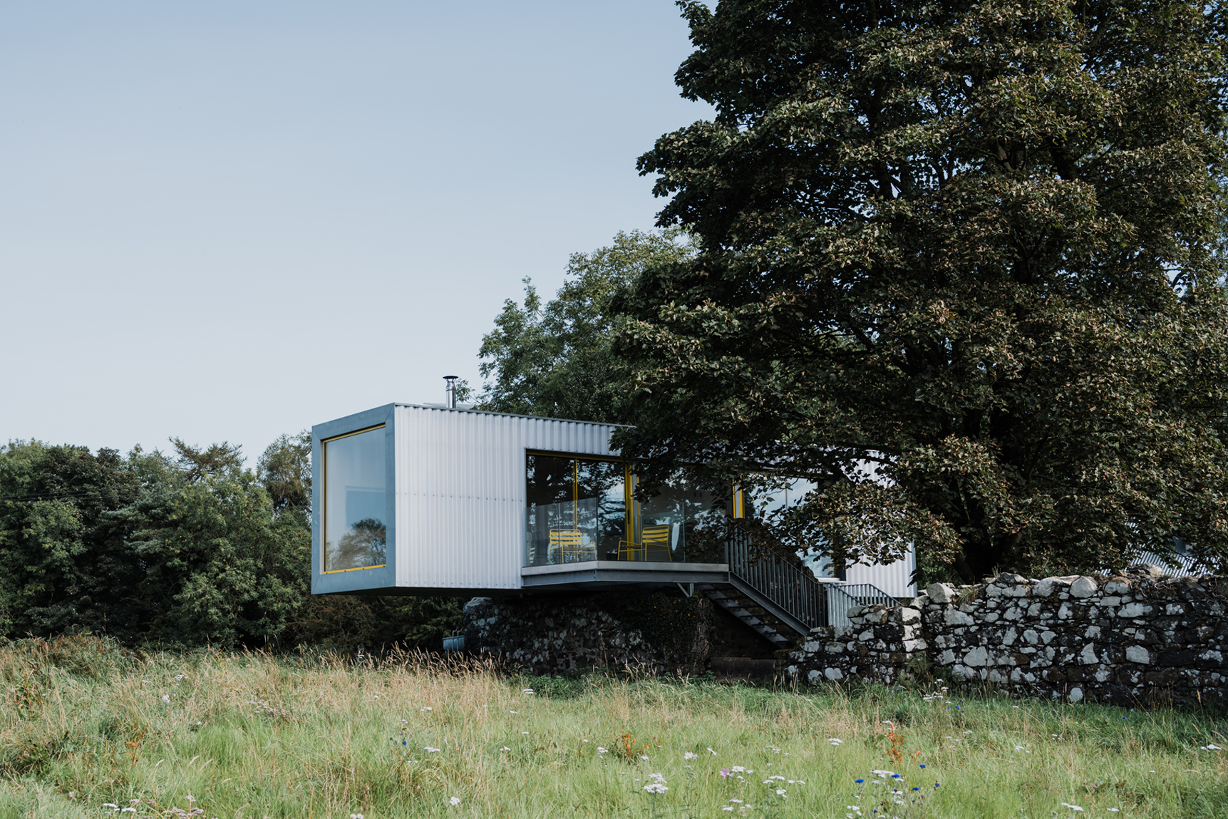 A bold piece of architecture which would completely contrast the 200-year-old Irish cottage ruins. The original cottage was last lived in by the clients great-great uncle Barney, hence the name. The clients were determined to protect the importance of the site and in keeping the walls of the cottage, create a building that gently floats above the stone walls without any disruption. And by fusing old and new, give the Irish clachan a new lease of life in the 21st century preserving its history. The house has been designed as a retreat for the clients, and occasionally the wider public. In time, it is the intention that the house will serve as a retirement home. The house could be viewed as an ’extension‘ of the original cottage, throwing it into the 21st century. The restoration and preservation of this dilapidated clachan has extended its lifecycle preserving its history in the local community and that of the clients’ ancestors. The design called for an out of the box thinking and creativity to turn the clients’ ambitions into reality. To cantilever over the ruins the simple building sits atop a set of steel columns, projecting into the wild flower meadow and illuminating like a dazzling nocturnal installation, appearing to float across the landscape at night, like magic. The old barn adjacent has been converted into a guest annex, reusing the existing stone wall structure with a shuttered concrete fireplace and chimney breast, topped with a galvanised corrugated steel roof, a nod to its agricultural past. The client wanted to preserve the character of the small annex with the mood considerably dark and eery in comparison to the bright modern cantilevered house.