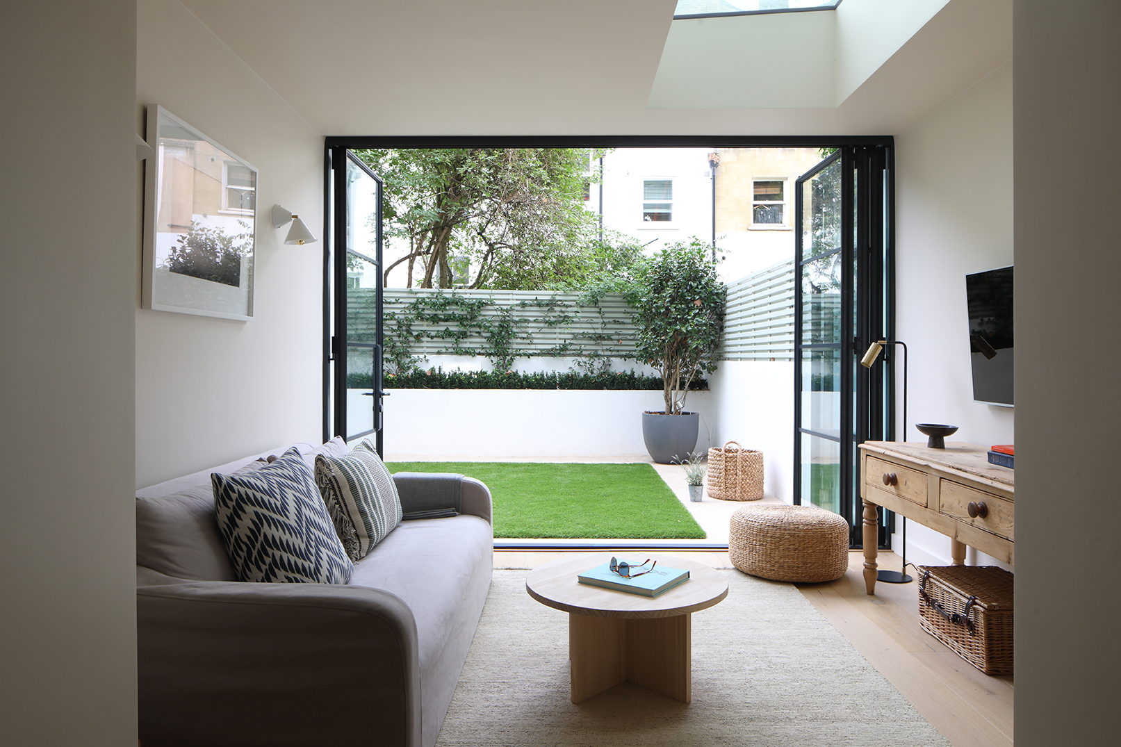The design for the space focusses on a large, central, open-plan kitchen. The home is a place for rest and joy, Christmas and summer holidays, barbecues and family gatherings. The central space, with the modest rear extension is conceived as a space for parties, socialising, family gatherings, and Christmas lunches. Crittall style doors connect the flat to a generous and sunny town garden designed for easy maintenance and year-round enjoyment. Space to the front of the property that had previously been external coal vaults were underpinned, tanked and connected through to form a dramatic, vaulted, slightly subterranean spa-style bathroom. The spaces are tied together with elements of bespoke joinery, oak flooring, and a palette of complementary colours and materials. The result is a calm and restful apartment, fully fitted and quietly awaiting the family’s next visit.