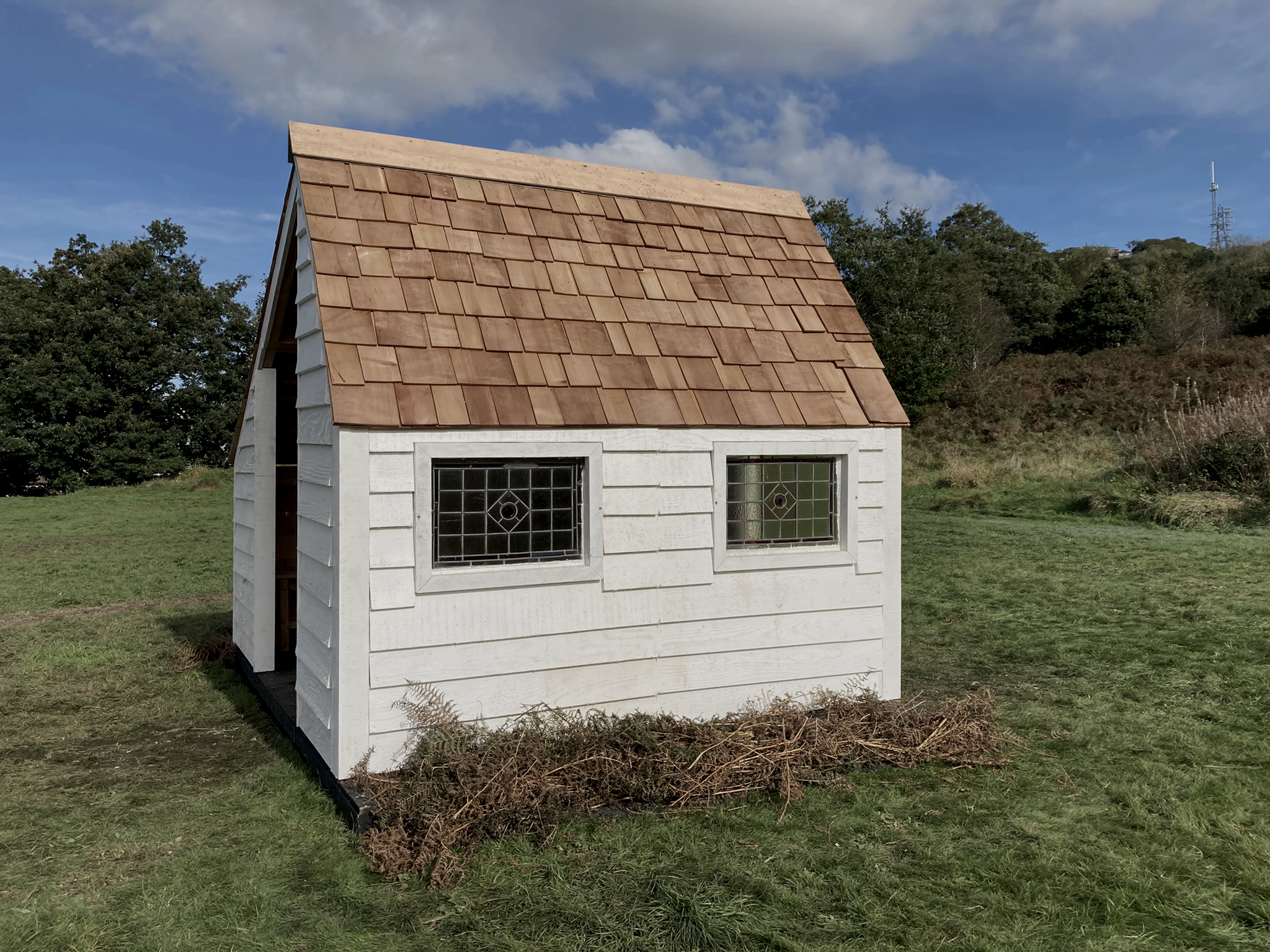 Based on the Welsh tradition that if you start building a house at sunset, and have smoke coming out of its chimney by dawn, the land is yours for the distance that you can throw an axe from its front door. Originating in the 17th century, the tŷ unnos ('one-night house’) tradition was a response to land enclosures that drove farmers from the traditional commons. Few of the original structures exist today, as they were built out of materials such as wattle and daub, but they were rebuilt over time out of more permanent materials, and there are many such small houses across Wales that historians believe to be the legacy of the tŷ unnos practice. Our project was conceived by Citrus Arts, a circus and performing arts organisation based in Pontypridd. The vision was to make the construction of Tŷ Unnos into a public performance, to raise awareness of the legend and open up conversations about access to land, affordable housing and solutions to the housing crisis. Our construction strategy was to prefabricate panels to make up the walls, roof and floor, which were all bolted together on site on Pontypridd Common. The frames are UK grown Douglas Fir, with Larch wall cladding and cedar roof shingles. The structure was built by local young people, as part of an apprenticeship scheme, and they practised many times to get the build time down to just under an hour. As the sun set on the common on the evening of Friday 13th October, an audience of over 200 people watched as the house took shape, accompanied by live music and fire drawings, culminating with the ceremonial lighting of the wood burning stove to make smoke rise from the chimney.