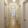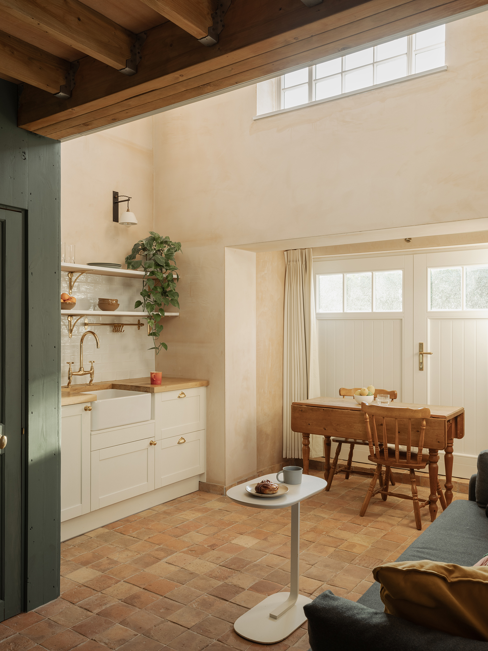 As a sustainability advisor and a new mother, the client’s priority was to practice what they preach and commission a responsible design to make them proud both professionally and as a parent. The architectural response to this brief was to combine outstanding thermal performance and circular design approach; whilst creating an aesthetically pleasing, serene space for rest and play. Three elevations of the cherry store are pierced with unique, scattered windows. Opening up the space into a single room, exposing the pitched roof and forming a half-depth mezzanine, has ensured a feeling of connectivity and a tremendous quality of light in the space throughout the day. Reclaimed materials include terracotta tiles from a derelict building, discarded Victorian floorboards from another TAK project, and original doors from the client’s childhood home. Kitchen and bathroom tiles, as well as the paint used, were also left over from other projects. The metal balustrade was made in a small local workshop just 10 miles away from the site. Raw plaster walls create a calming atmosphere. The use of natural and recycled materials add to the character of the space. Reuse and staying true to materials are key themes of the project, and also played a vital role in keeping to a modest budget. ‘Reclaimed’ and ‘sustainable’ can be seen as words attributed to something aesthetically inferior, though boasting of environmental performance. This project demonstrates that that does not have to be the case. Environmental accountability and circular design also contributed to the project's distinct character.