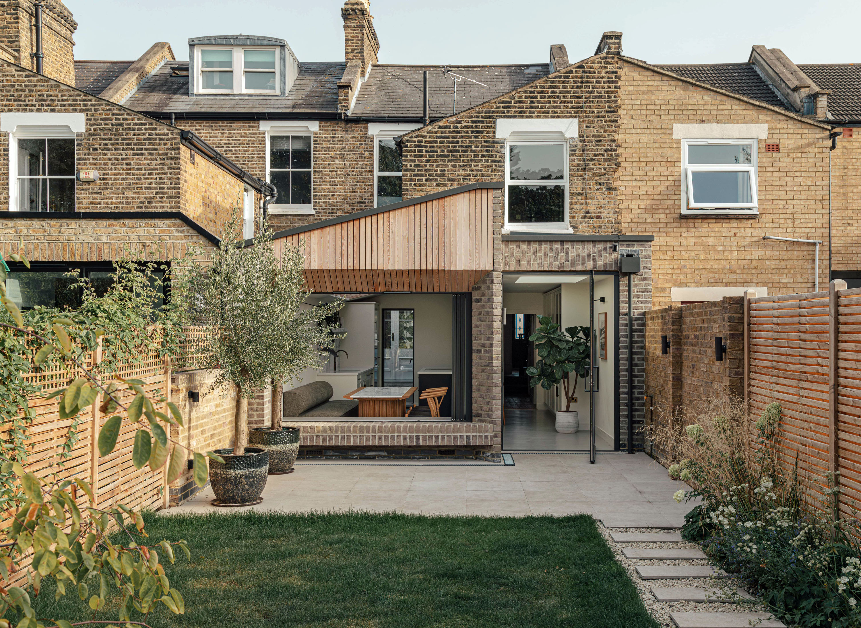 The side return part-infill, rear addition and renovation of the ground floor providing a new flexible-use kitchen and dining space. The key driver behind the client’s brief was to create both a functional family kitchen and a versatile social space to be used for entertaining which also provides a direct connection to the once easily forgotten and under-utilised rear garden. Previously used as purely a route to and from the garden room, the multi-use addition to this home opens into the rear garden enabling the rear of the house to function together. The new rear glazing is formed by two elements. Firstly, the large pivot door providing access into the garden and creating visual continuity, drawing you through the house from the entrance hallway - which was distinctly lacking before. Secondly, the dual-sided window seat, internally used for dining, externally for seating and enjoying the garden of a summer evening. Furthermore, both elements of glazing fold back to the central masonry wall, fully opening the rear elevation to the garden. These two elements (access and seating) were fundamental in developing the layout of the internal and external spaces, creating clarity of circulation and the window seat informing and being formed within the architecture itself. Due to the North West orientation, the angled larch cladding and brickwork are used to 'scoop' in (notionally and actually) the afternoon and evening sun. Use of ceiling/roof forms and rooflights to zone the differing uses (kitchen, dining and circulation). The vaulted ceiling with exposed Douglas fir timber roof structure frames the rooflights, provides privacy, and maximises the daylight received and height whilst falling within planning guidance.