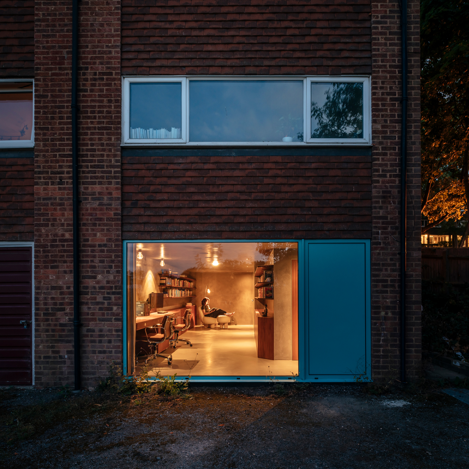 Desiring a dedicated space for work, reflection, and leisure, they approached us to transform their neglected garage into a secluded haven. Nestled at the base of a 1970s four-story end-of-terrace house, the garage presented unique challenges, notably the absence of natural light in its 8-meter depth. Rather than viewing the limited light as a hindrance, we leveraged it as an opportunity to manipulate human perception. Contrary to the common belief that painting a room white enhances natural light, we opted for dark grey tones. This unconventional choice played a visual trick, making the subdued light more pronounced through the power of contrast. In addition, we recognized that in spaces with limited light, textured materials outperform smooth ones. The filtered light washing gently over the room highlighted the uneven character of textured materials, creating an atmosphere that embraced the lack of direct sunlight. Functionally divided, the space features a front desk area for work and contemplation, while the rear serves as a cozy reading and music-listening nook. Infused with the couple's distinct personalities, the entrance welcomes visitors with a medical skeleton named Adam, reflecting Lila's profession. The shelves adorned with books on medicine, fantasy, and science fiction further showcase the diverse passions of Duncan and Lila, weaving their individuality into the fabric of the transformed space. This project defies conventional design norms, proving that innovation can arise even in the face of constraints, ultimately providing a sanctuary for this dynamic couple amidst the challenges of the pandemic.