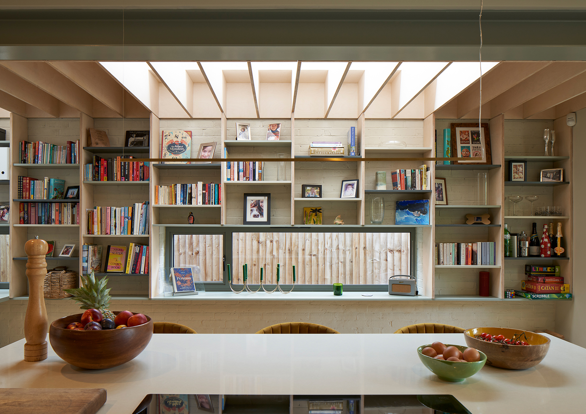With the addition of a side single-storey extension, courtyard patio, and garden studio to create a family home for a couple, their four children, and two dogs. The existing outbuilding in the sideway was demolished and a side single-storey extension was added to create a larger kitchen/dining/living area arranged around an island and a table. ZDB Architects worked closely with structural engineers, Blue Engineering, to develop the roof structure of the extension with only 24 mm thick, but 330 mm deep birch plywood roof joists @ 300 mm closely spaced centres. These joists not only define the space and naturally filter light from the rooflights above, but also form a baffle to prevent overlooking from the upper floors of the side neighbouring house. The joists were emphasised by birch plywood ribs descending the wall to become built-in shelving, a desk, and window surround, to create a home office for Kira in the heart of the house. In the middle of the back garden a studio was added to create a flexible home office for Jonathan/gym/additional living space, with a courtyard patio between it and the house on one side and a secret garden between it and the rear neighbouring house on the other. The garden studio was sunk a few steps down below ground level to nestle it into the garden and to minimise the impact on the existing rear extension and side neighbouring houses. On one side a picture window provides a view across the courtyard patio to the house. On the other side wide sliding glazed doors provide a view up the brick paved steps, through the planting, to the seating area in the secret garden.