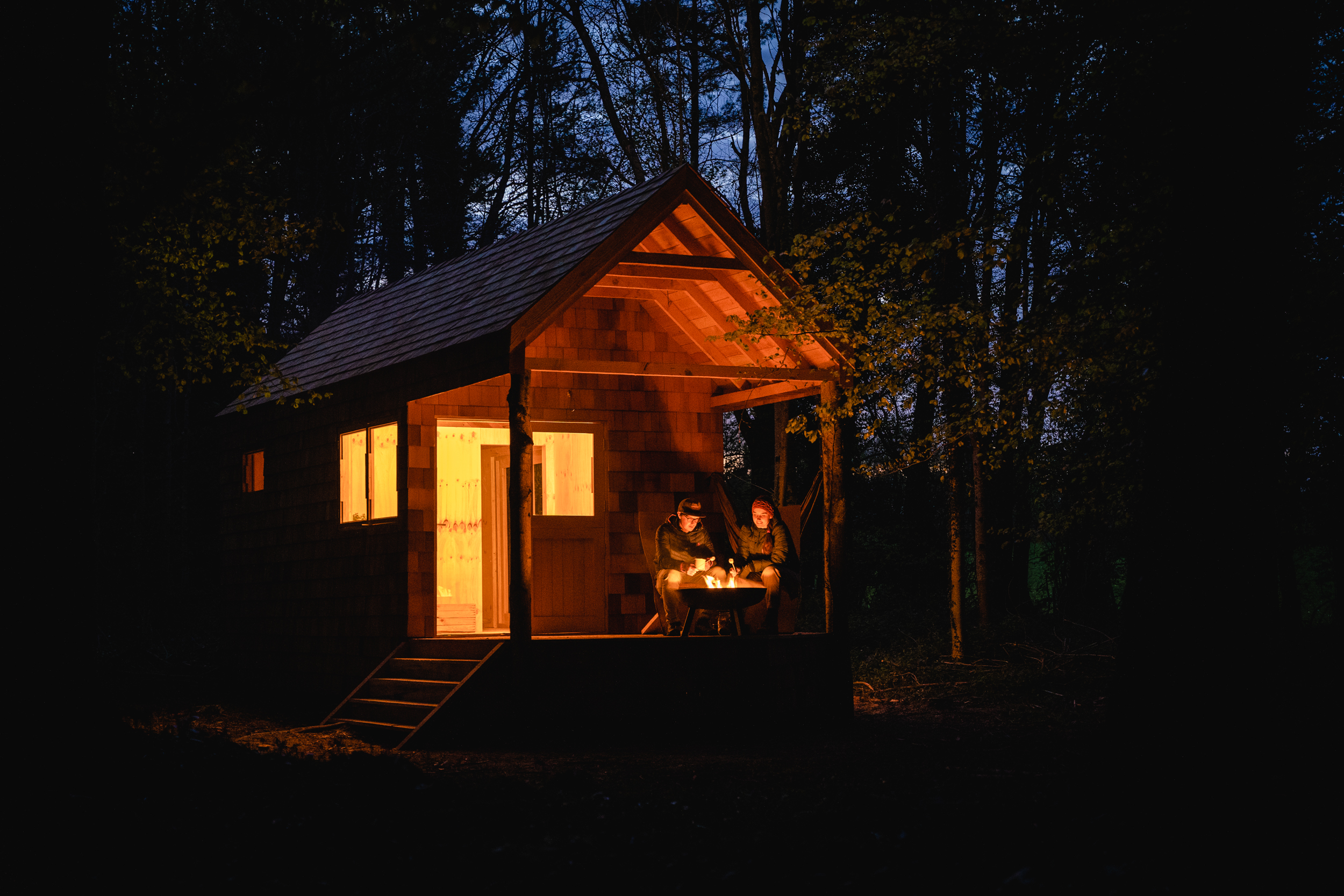 Part of a wider agricultural regeneration project including cabins, a wood fired sauna, communal dining spaces and composting loos. The bespoke, hand-crafted, mobile cabin has a shingle-clad exterior that blends seamlessly into its woodland surroundings. Externally, there's a deck with a large fire pit and wood fired outdoor bath with views of the surrounding woodland.