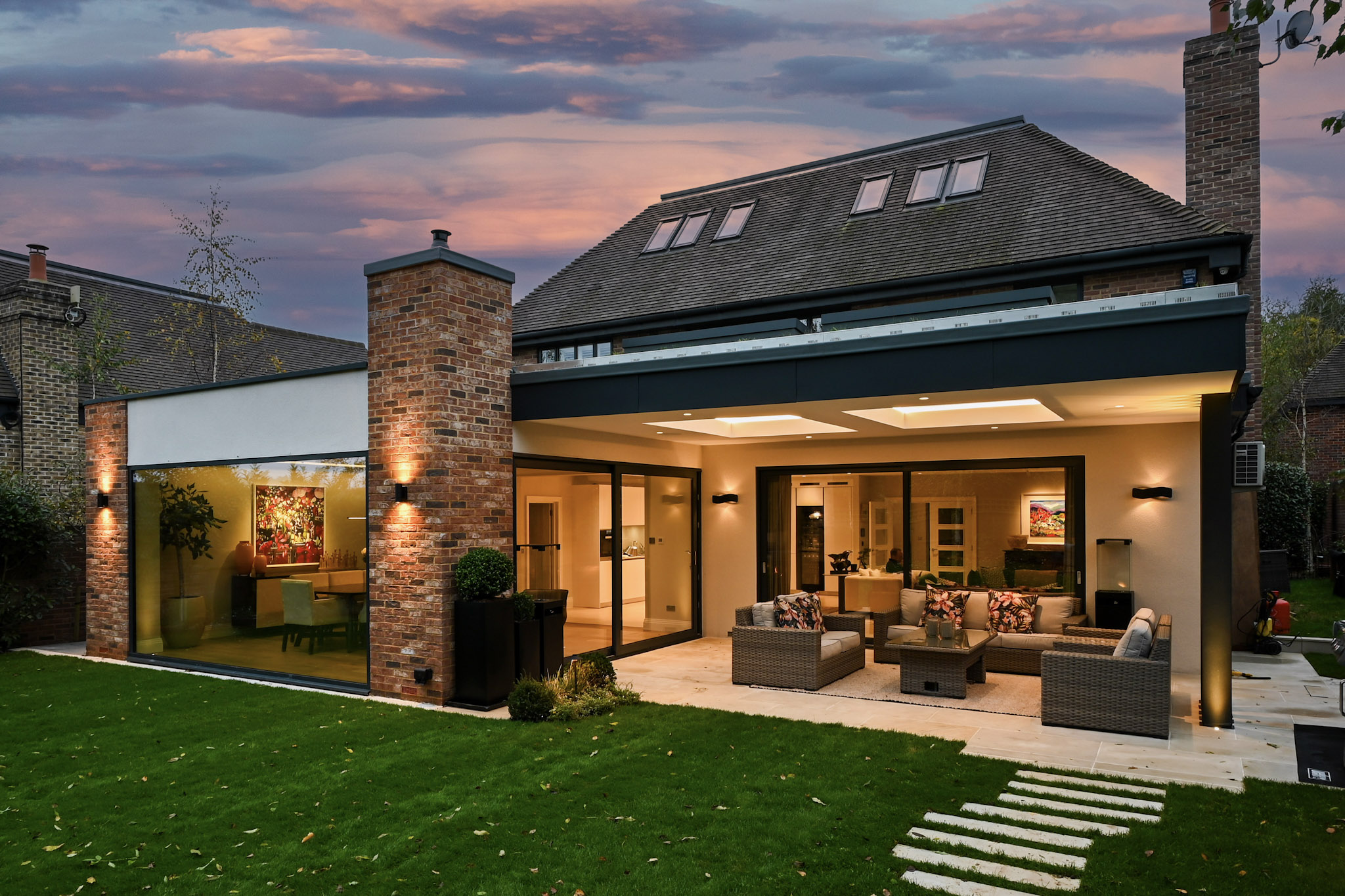 To create a suitable entertaining space which can be also used as a general dining area. Their ambition was to extend to the rear of the property. Initially, it was discussed making use of the existing openings as the link to the house which will have a small benefit to the house. One of the key considerations was light. They didn’t want the new extension to block off any light into the existing property. The finished extension came out over 5m, with a new wildflower sedum roof also laid over the new extension, which can be seen from the balcony area off of the principal suite. The extension features a new interior dining room with full-height glazing and an undercover entertaining space, with two large rooflights over the external seating area, and another smaller stripped rooflight over the new internal dining area. To the corner of the extension, there is an integrated chimney for a new gas fire, with a fully openable corner, integrated joinery, hidden guttering, and underfloor heating. Throughout inside and out, there is a high-quality finish which compliments the existing house. The garden was designed by a landscape designer and centers around a bespoke fire bowl space with a handmade, semi-circular, western red cedar bench set. There is also sandstone paving and an integrated lighting design situated around the extension & the garden space.