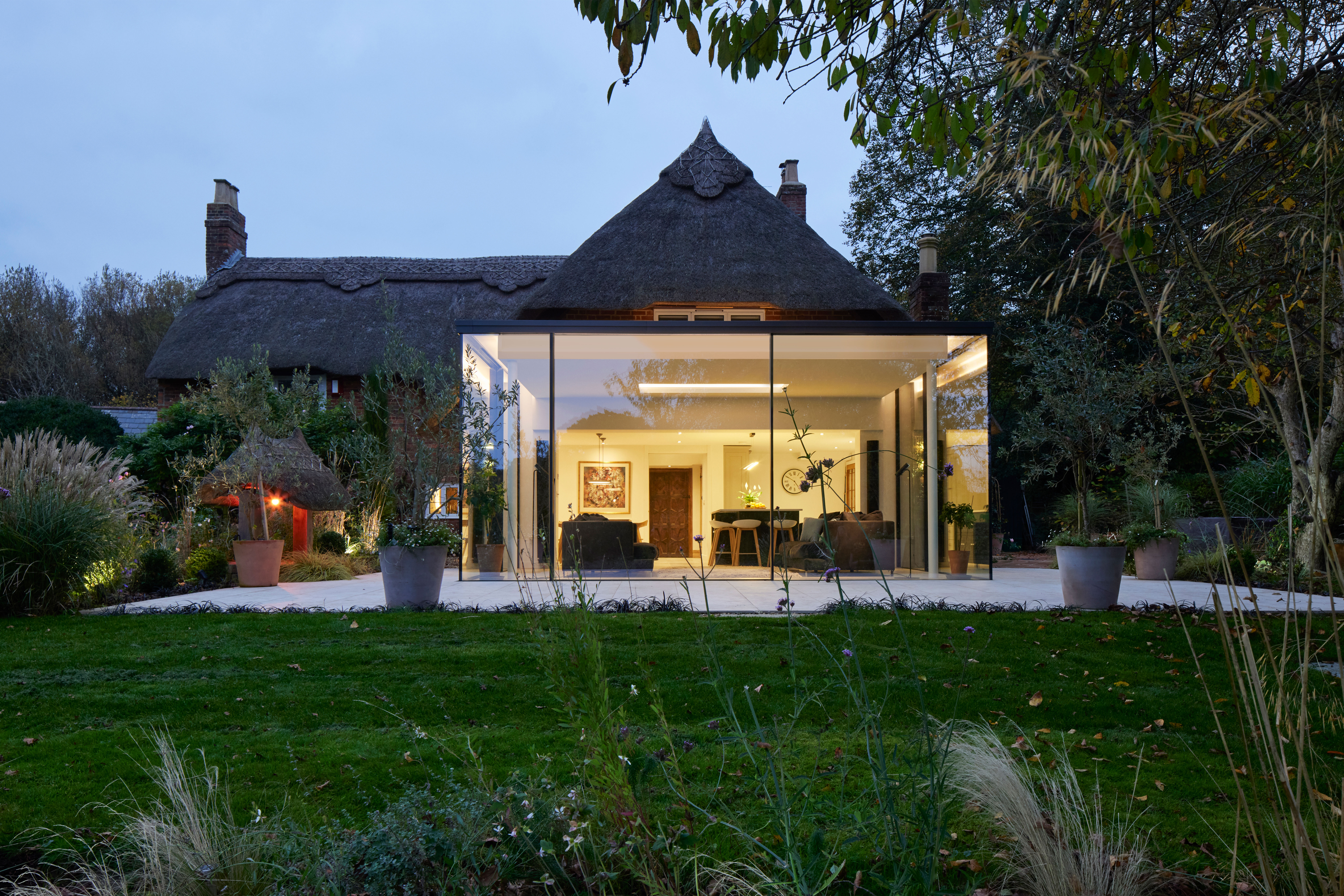 It was clear from the first visit that the interior had a limited visual or physical connection to the rear amenity. The extension was designed to be as visually lightweight as possible, with the profiled aluminium fascia at only 120mm (which covers a roof membrane, structure, and glazing track) and bi-parting sliding doors with a maximum frame width of 25mm. The junction between new and old has been expressed in a very sensitive fashion, with glazing running straight into the face brickwork, with no visible framework. Similarly, the flat roof has no visible flashing, making the box appear as though it is gently resting against the house. The addition has created a highly insulated and efficient structure, which has three large openings for passive cross-flow ventilation. At the design stage, we modelled the site, including a cluster of mature trees, which in the summer months provides shading to the structure, when ordinarily solar gain could be a problem. Client comments: "For many years we had wanted to find a way of adding more light and space to the rear of our otherwise-perfect period cottage. Commissioning Sean and the team at DMW to realise this dream has worked brilliantly for us. From the outset, they understood our needs and worked patiently with us to create a beautiful design that met them in full. The close collaboration between DMW, the contractor, and us meant that we felt fully in control at all stages of the project. Our home has been transformed in the most remarkable way and we could not be happier with the outcome."