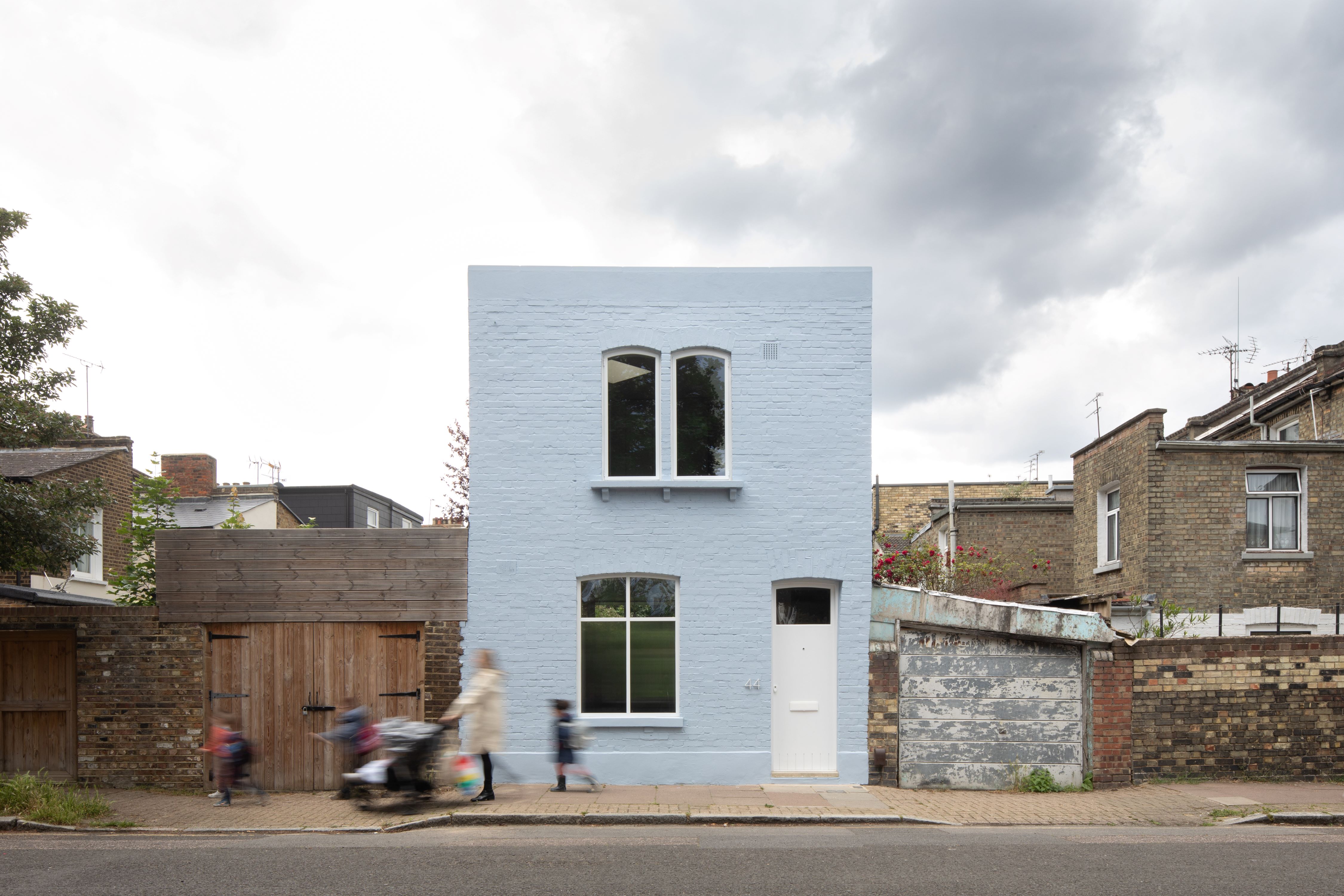 The house enhances the characterful existing building with a modern interior that reflects its street presence. The façade, flank walls, slab, and joists were retained, with a first-floor rear extension over a small terrace. Externally, changes are minimal, with new windows, extended walls, and a repainted façade in a lighter blue resembling Wedgewood Jasperware. The ground floor is a textured box, contrasting with three precise joinery pieces containing a window, the stair and kitchen, or terrace doors that fold away for semi-outdoor dining. Upstairs, bedrooms and a bathroom feature skylights for light and ventilation. Cork flooring limits sound, and lime render provides a textured finish. Reclaimed bricks were lime-mortared, cement was minimised, and insulation includes cork and double-glazed windows. A gas-free electric boiler was installed, and vapour-permeable lime-plastered surfaces replace plasterboard. The project shows how historic buildings can be adapted sustainably while remaining personal and moving.