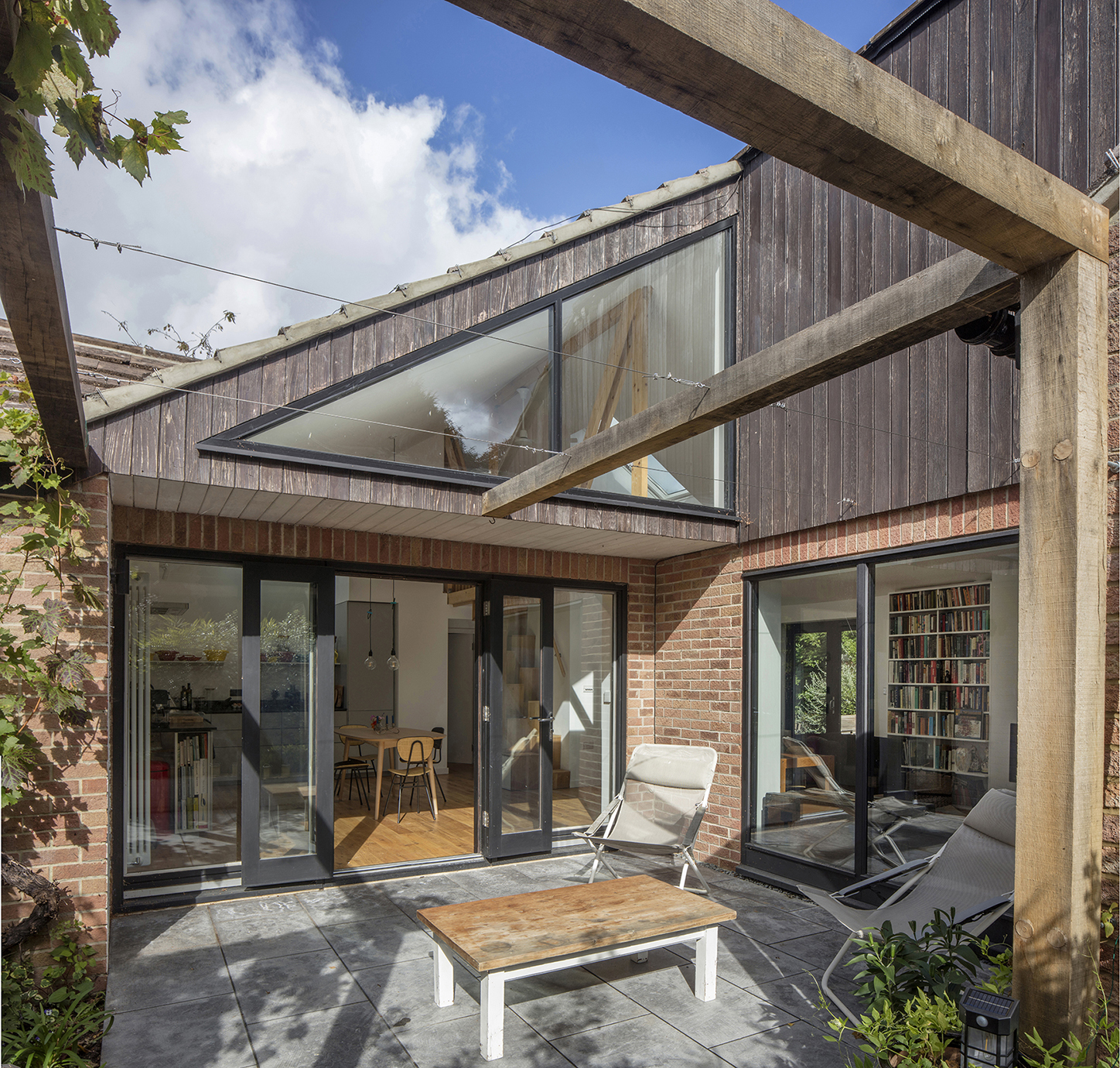 The original 1980s bungalow had low ceilings and heavy eaves that blocked exterior views. While its layout clustered living spaces around a courtyard, high walls separated it from the mature garden. The first step was removing these walls and installing a flush patio to connect the house and garden, with a pergola and trellis preserving a mature vine and ensuring privacy. Inside, stripping out the low ceiling opened the living room and kitchen into the roof, creating a sense of space and providing walls for the client’s painting collection. New windows and roof lights, including a high-level triangular window, frame views of trees and sky, enhancing natural light and passive ventilation. A ground-floor bedroom was refurbished as a self-contained space with an ensuite, suitable for renting or future live-in care. A guest bedroom/office was added in the newly opened loft. A timber truss supports the retained concrete roof tiles and incorporates a balustrade for the bespoke timber paddle stair, with storage below. The red-brick cavity walls were lined with a superfoil quilt for optimal insulation and airtightness with minimal wall build-up. Woodfibre insulation was used for the roof, and the recently upgraded gas boiler was retained.