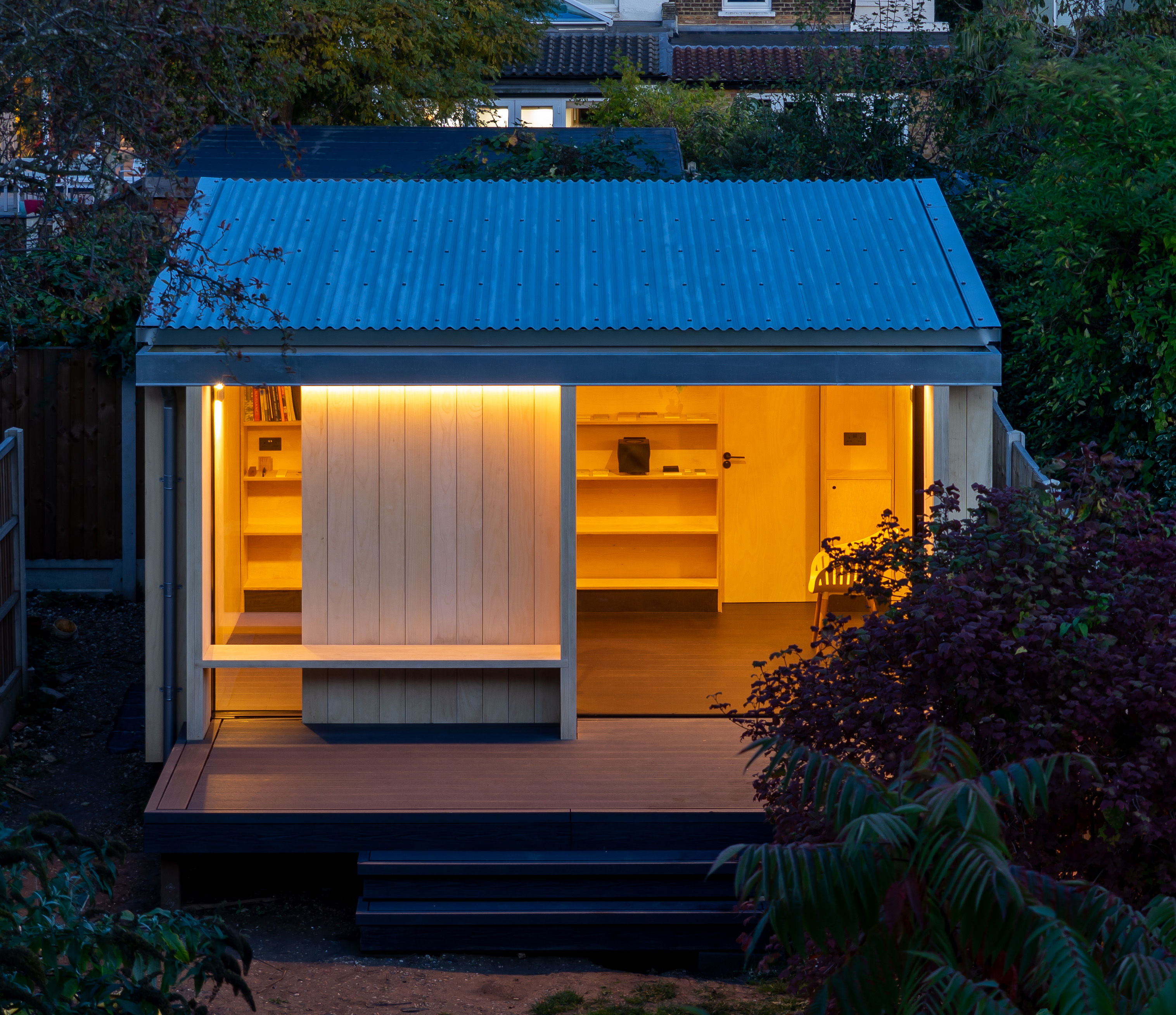 Post-pandemic, we rethought the nature of work and wanted to transition into a small lightweight business. Our primary workspace is now our Garden Studio in Leigh-on-Sea, which we designed, procured, and managed the entire construction for ourselves. We are a team of three:- a director/architect, a quantity surveyor/director, and a project architect. We now work remotely between the garden studio and a shared London workspace, with most of our projects being based in London. The studio design is simple, with a workspace at the front overlooking the garden and storage at the rear. A split tilted roof creates a clerestory window for east-facing daylight, while the raised deck enjoys westering sun in the afternoon. A built-in bench in a deep window reveal provides a nook to look over the garden. The reveal hides a gutter which doubles up as small porch. A pocket door opens the space fully in summer, connecting the studio space seamlessly to the outdoors. While primarily a workspace, the studio doubles as overnight accommodation, as well as an exercise space positioned remotely from the house. It enables extended stays for our elderly parents. Built with sustainability in mind, the structure uses no concrete and is supported by 12 two-meter-long screw piles. The timber construction is clad in untreated accoya timber, with the roof and side finished in cost-effective galvanized sheeting. Internally, rejected birch plywood sheets clad the walls and black cork tiles cover the floor. There is a small toilet and bike store to the rear. High levels of insulation regulate energy usage, and heating is provided by a single air heating unit. usage, and heating is provided by a single air heating unit which is only required in winter. We bought every last screw ourselves and we love it!