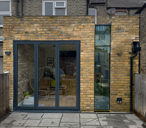 The client asked for the extension to be modern and with clean lines and to be inspired by Mondrian and Hockney artworks.