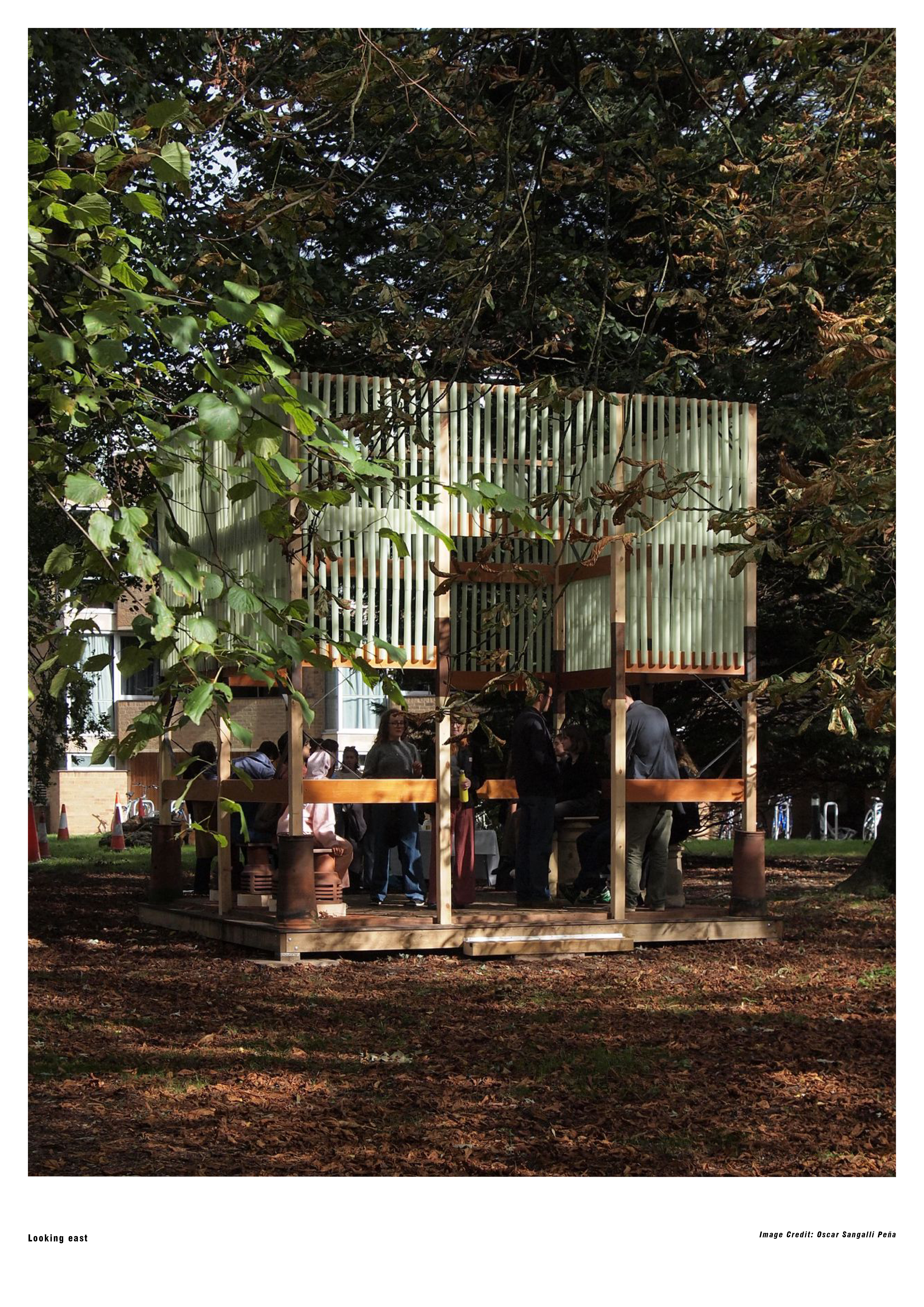 It does not provide shelter as warm, insulated buildings surround it. Instead, it offers something new. The Stack is an experiential sculpture and a statement against the excessive spending seen in institutions like Jesus College, which is the fourth most well-off out of the thirty-one in total. Working within these restrictions shaped the process: materials were foraged before design began. A material palette was established—grey cobbles, red handmade Cambridgeshire bricks, and disused chimney pots from nearby student houses. The ‘as found’ approach reframed the ordinary, embracing the inherent qualities of materials: ‘the woodiness of wood’, ‘the sandiness of sand’. Here, the ‘clay-ness’ of bricks, rusted metal brackets, and opaque sapling tubes became integral to the design. This approach was first difficult to justify; despite promised savings, the maintenance team sought a budget increase. However, as discussions evolved—with a rough ‘cigarette packet sketch’ in hand—perspectives shifted, demonstrating how much could be achieved using only what was available within the grounds of the college. This philosophy plays out in layered materiality. At ground level, heavy elements—bricks and cobblestones—create stability. Above, sapling tubes form an opaque screen, shielding users while drawing the eye upward. This contrast between weight and lightness creates a dialogue between permanence and elevation. By focusing on the ordinary, The Stack embodies bricolage, proving the continued relevance of the ‘as found’ philosophy in contemporary architecture.
