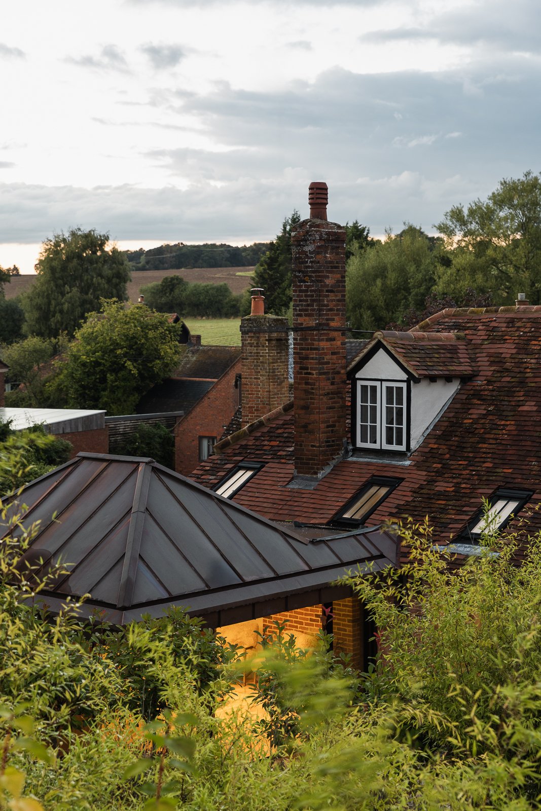 Having previously undergone a conversion into a dwelling, this project aspired to create a proportionate and contextually considered extension to the public house, linking the dwelling with its extensive garden, within which also sits a listed 18th-century timber barn. The site has a unique sense of place that commands a clear design dialogue - a sympathetic distinction between the new intervention and the historic fabric. The copper cladding which envelops the extension compliments the hues of historic clay tiles and brickwork whilst announcing itself as contemporary. The extension's pitched form responds to the existing hipped roofline and echoes the series of chimneys punctuating the host building with their pitched throats. Strong visual connections from the living accommodation to the landscape are established through a floating bay window, directing views up the steep garden from its nestled position. Lightweight glazed doors open the space into the patio courtyard and allow light to penetrate through to the existing parts of the plan. Low-energy techniques were introduced as part of the building conservation process. In dealing with such a sensitive context, the project aimed to illustrate the transformative power of a small intervention that also unlocked hidden historical fabric. The existing western chimney, which had been concealed by an earlier adaptation to provide WC accommodation to the pub, was reinstated as a central feature within the building plan. It now marks the transition point between old and new as you step down into the original bar retained as part of the previous works.