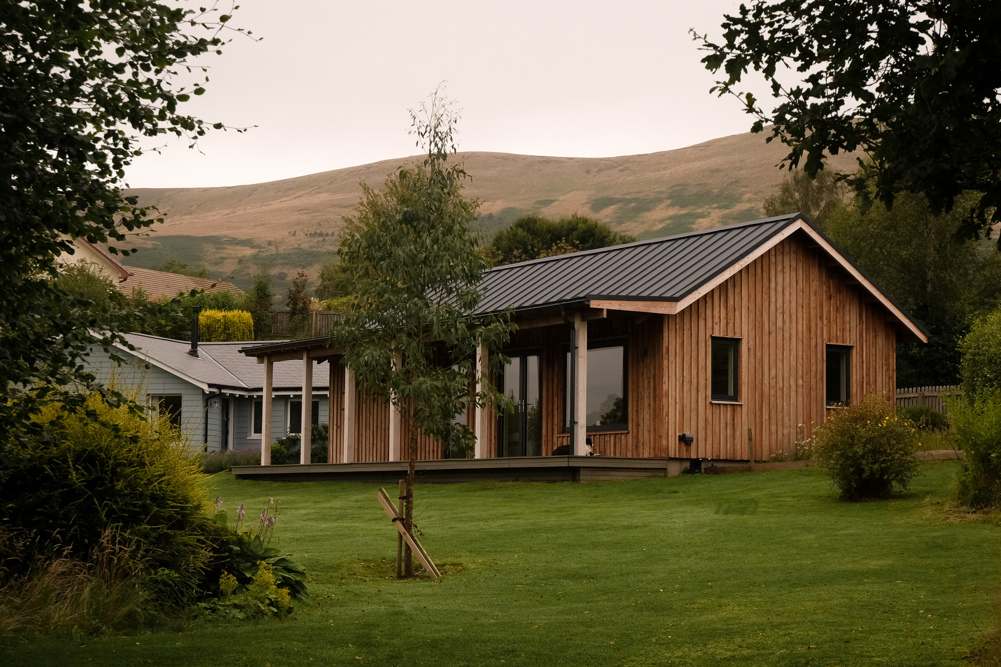 Along with the studio, the scheme includes a utility area with wc, storage space, and a covered external verandah which looks over the beautiful and tranquil garden. Retaining the shell of the existing garage (floor slab and walls – the defunct flat roof was removed), and reusing the concrete foundations and below-ground drainage of a previous, unrealised, project minimised the carbon footprint of the proposed building. Both old and new elements are clad in timber and roofed in aluminium, giving a coherent aesthetic across the scheme. The building fabric focusses on the use of sustainably sourced timber throughout; whether in the wall construction, the exposed timber rafters and verandah canopy, or the timber cladding. This materiality gives a gentle warmth, which works well in the rural village context. Large glazed openings offer lots of natural light to the studio and provide good views over the attractive garden. The well-insulated and airtight building fabric ensures that energy consumption, emissions, and running costs are kept to a minimum. While the scale of the building is modest, it provides a flexible space which is used successfully in a number of ways, not least for making pottery, which was its original intention. The project, which effectively retrofits the original utilitarian garage, while creating a new pottery studio space is a good example of the way that good quality design can prolong, enhance and renew the life of existing buildings and structures.