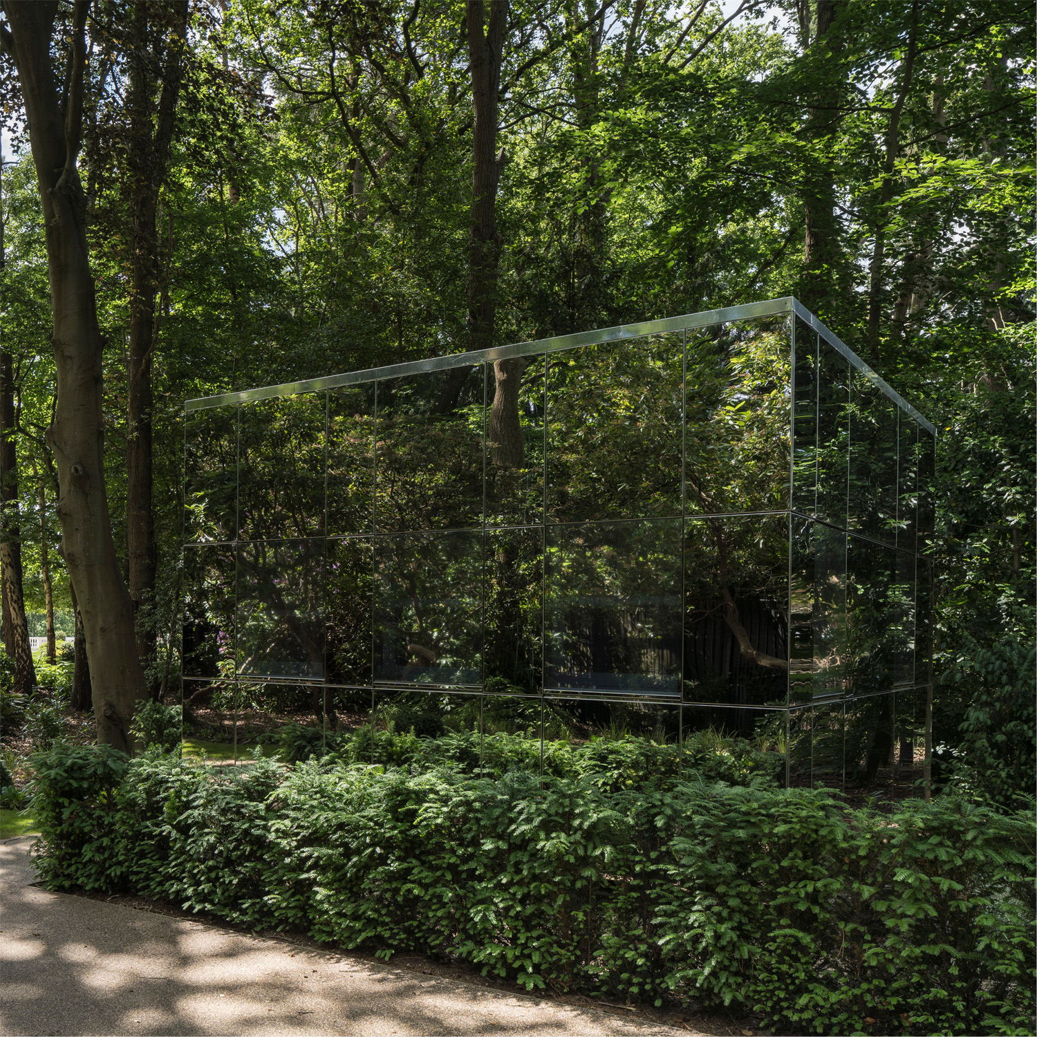 Set within an overall tree preservation zone and deep within the green belt, our client wanted an unobtrusive folly which could not be seen from the house and gardens which could be used as a home office or retreat. The local authority initially would not support any new building, however we imagined a mirror cube reflecting the landscape and trees, elevated above the ground plane and supported on drilled piles avoiding tree roots, which gained approval and achieves the client’s desired outcome, fitting seamlessly into the surrounding landscape. The project measures only 18 square metres, and comprises a polished stainless steel external finish, a Bauder inverted intensive green roof and elevations made entirely of timber logs to encourage biodiversity, habitats for bugs and woodland creatures.