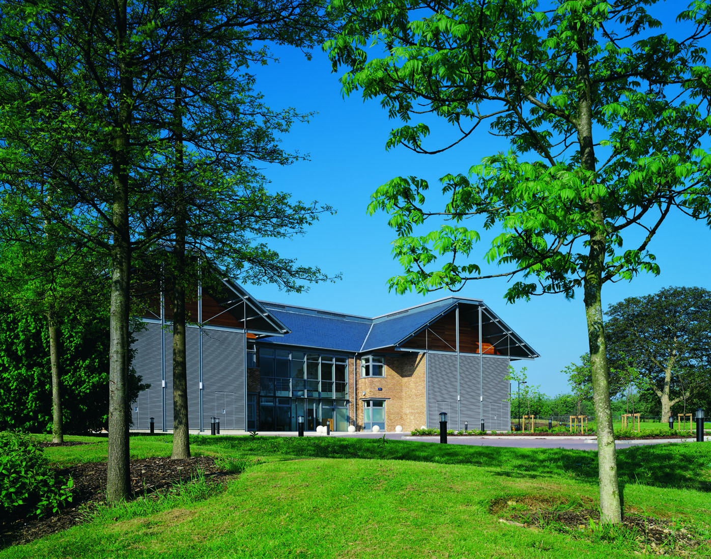 Seen from the roadway, 17 Kings Hill Avenue has a clear and distinctive form and a visible front entrance. The design responds to the developer's request for a building that reflects the local vernacular - evident, at this scale, in barns and oast houses with their massive roofs and brick and weather boarded walls.